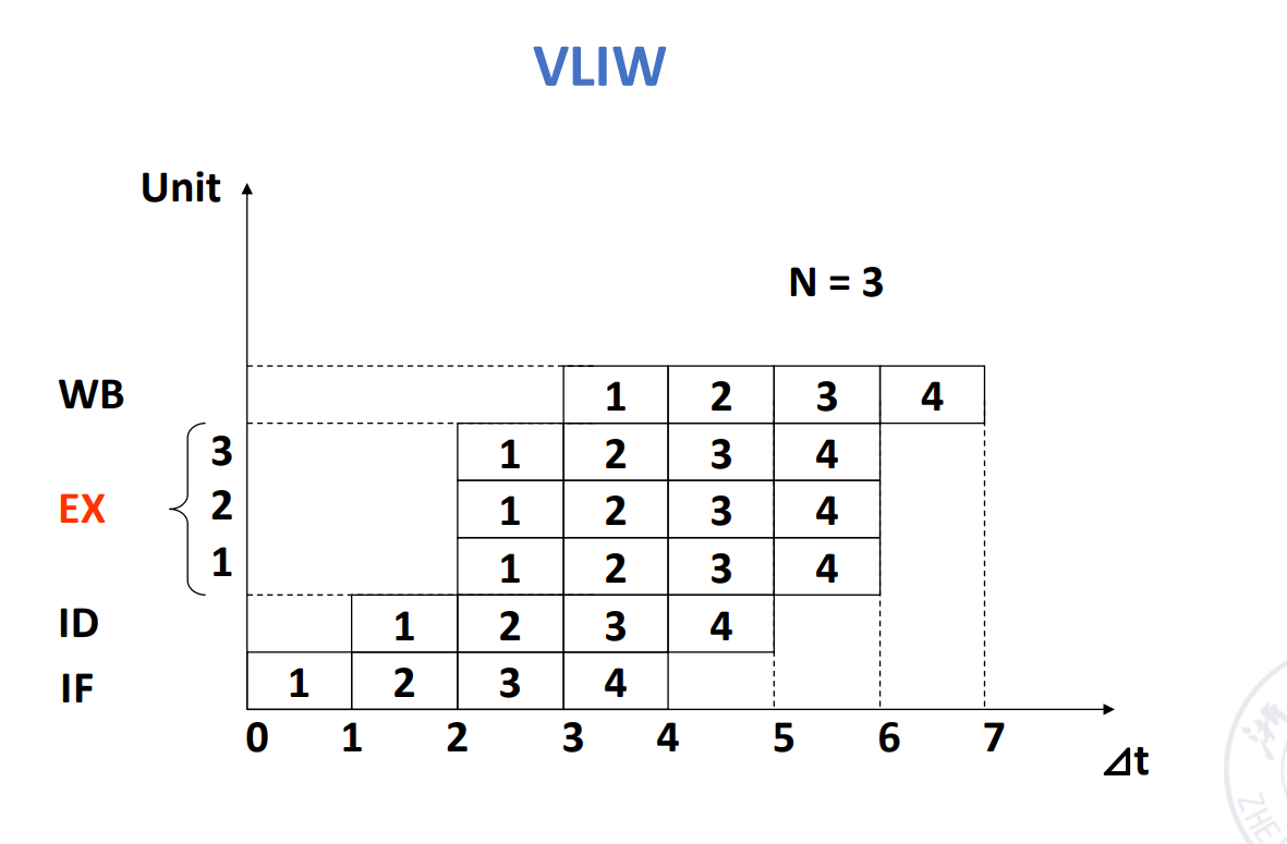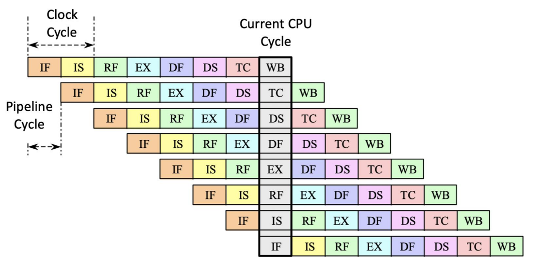 - 在一个周期能流出n条指令的super pipelined processor中,n条指令不是在同一时间流出的,而是每1/n周期流出一条指令